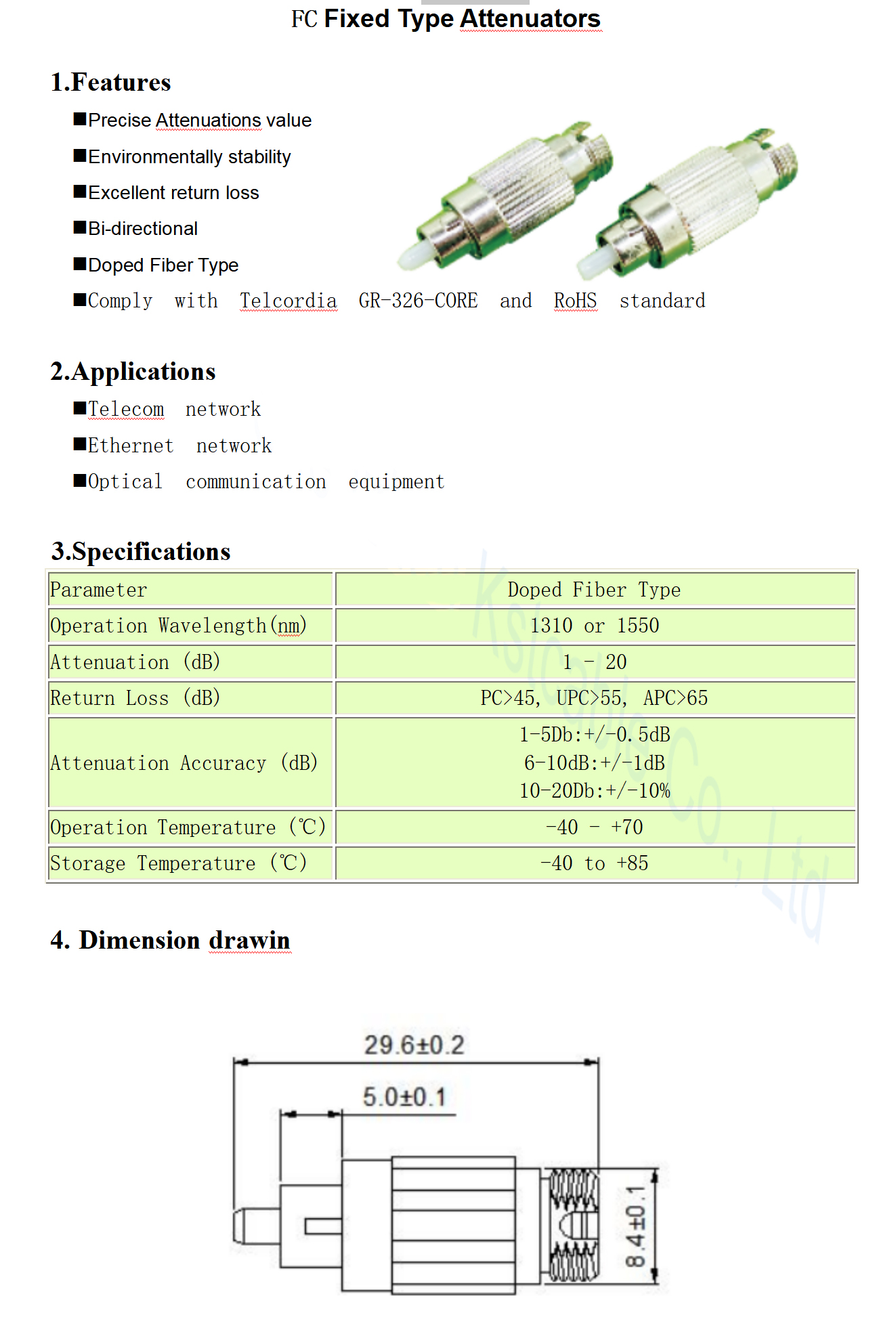 Optical fiber attenuator is a non-light source device, used in optical communication system debugging optical power performance, debugging optical fiber instrumentation calibration, fiber signal attenuation; The product is made of damped optical fiber doped with metal ions, which can adjust the optical power to the required level.