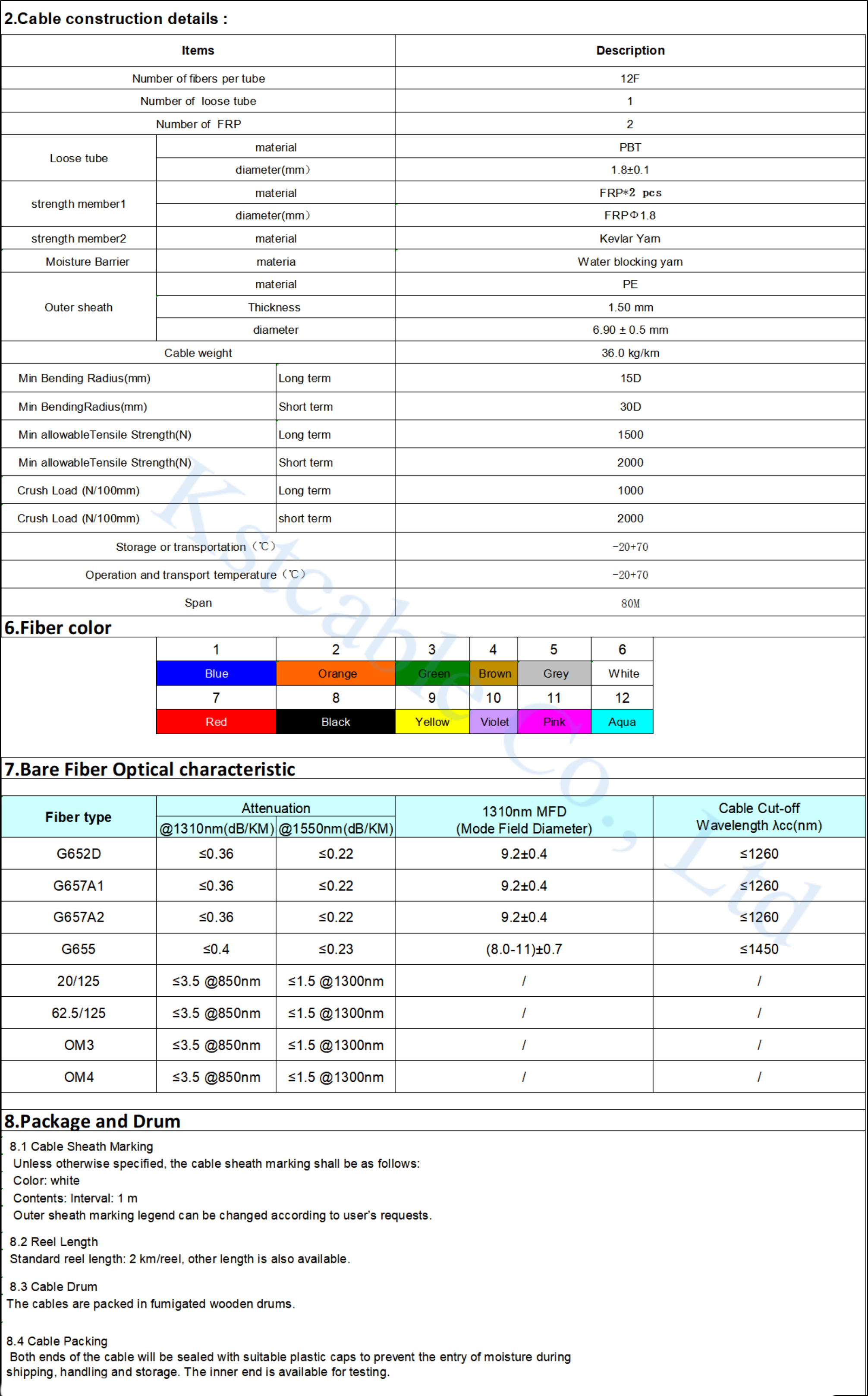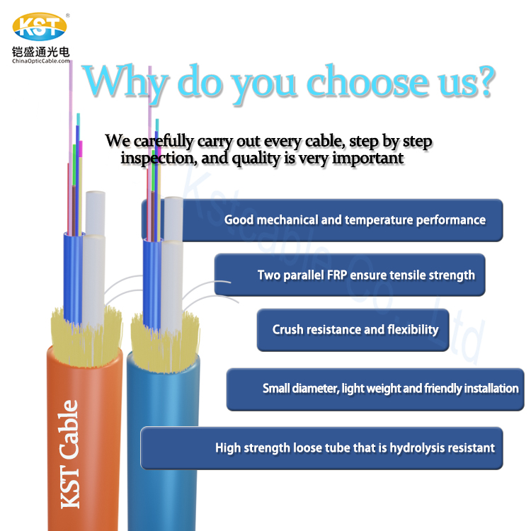 The 12 color fibers are placed in a loose tube made of high modulus plastic. The tube is filled with water-resistant filling compound inside. 2 FRPs with the Loose tube together form a stable triangular structure, this triangular structure with Kevlar yarn together functioned as tension strength member.The water-blocking yarn is mixed in the middle of the Kevlar yarn to prevent water, the utmost outside of the cable is PE outer sheath with Excellent cold resistance and corrosion resistance ability.